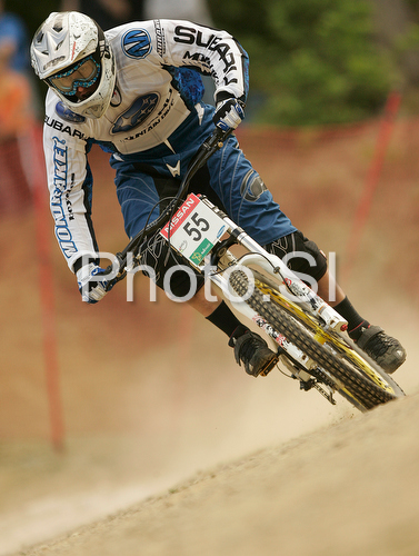 : Damien Spagnolo of France during men final run of first Downhill MTB World Cup 2008. First men race of UCI Nissan Mountain Bike World Cup 2008 was held in Maribor, Slovenia, on 11th of May 2008.