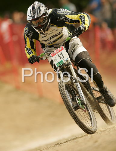 : Mickael Pascal of France during men final run of first Downhill MTB World Cup 2008. First men race of UCI Nissan Mountain Bike World Cup 2008 was held in Maribor, Slovenia, on 11th of May 2008.