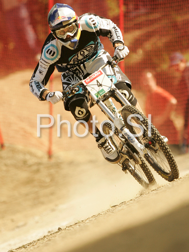 : Sixth placed Gee Atherton of Great Britain during men final run of first Downhill MTB World Cup 2008. First men race of UCI Nissan Mountain Bike World Cup 2008 was held in Maribor, Slovenia, on 11th of May 2008.