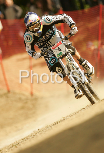 : Sixth placed Gee Atherton of Great Britain during men final run of first Downhill MTB World Cup 2008. First men race of UCI Nissan Mountain Bike World Cup 2008 was held in Maribor, Slovenia, on 11th of May 2008.