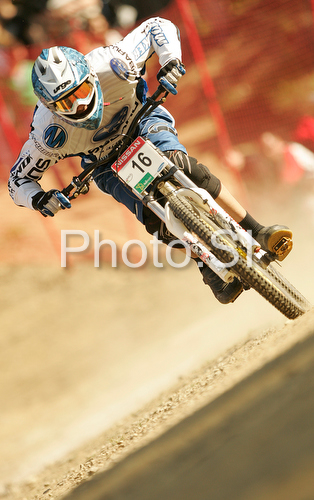 : Florent Payet of France during men final run of first Downhill MTB World Cup 2008. First men race of UCI Nissan Mountain Bike World Cup 2008 was held in Maribor, Slovenia, on 11th of May 2008.