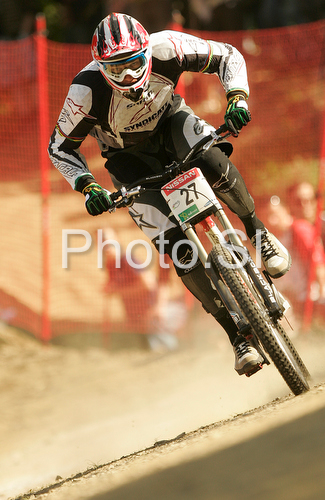 : Fifth placed Greg Minnaar of South Africa during men final run of first Downhill MTB World Cup 2008. First men race of UCI Nissan Mountain Bike World Cup 2008 was held in Maribor, Slovenia, on 11th of May 2008.