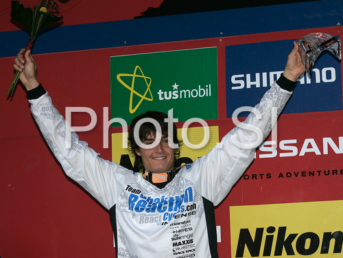 : Second placed Julien Camellini of France celebrating his medal won in men final run of first Downhill MTB World Cup 2008. First men race of UCI Nissan Mountain Bike World Cup 2008 was held in Maribor, Slovenia, on 11th of May 2008.