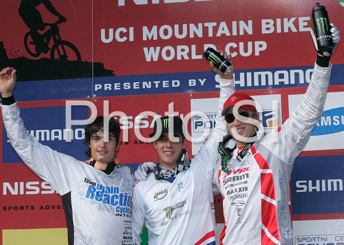 : Winner Samuel Hill of Australia (M), second placed Julien Camellini of France (L) and third placed Steve Peat of Great Britain (R) celebrating their medals won in men final run of first Downhill MTB World Cup 2008. First men race of UCI Nissan Mountain Bike World Cup 2008 was held in Maribor, Slovenia, on 11th of May 2008.