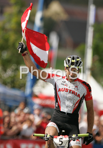 : Second placed Alban Lakata of Austria celebrates his medal in men UCI Mountain bike Marathon World Championships race in Graz - Stattegg, Austria. 104km long men race was held in Graz - Stattegg, Austria, on 23rd of August 2009.