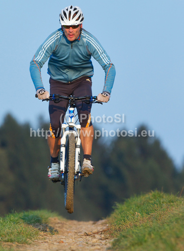 : Mountain biker riding his bike through fields near his home city of Kranj, Slovenia, on late autumn afternoon of Sunday, 10th of October 2010.