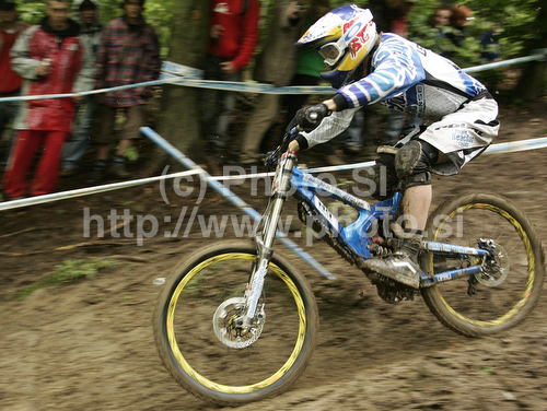 : Matti Lehikoinen of Finland riding during men Mountain Bike UCI World cup downhill race. Downhill race of Mountain Bike UCI World cup was held on Sunday, 16th of May 2010 in Maribor, Slovenia.