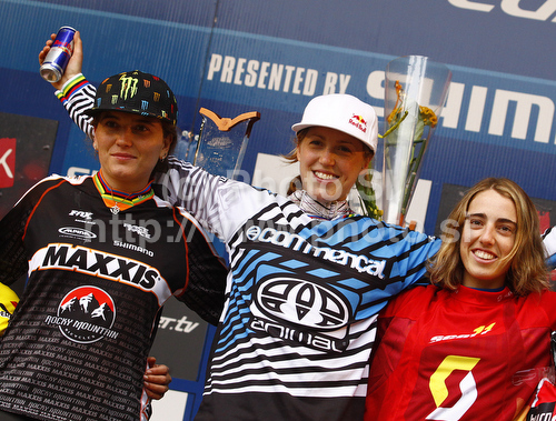 Maribor ,Slovenia - 16.05.2010 : Winner Rachel Atherton of Great Britain (M), second placed Sabrina Jonnier of France (L) and third placed Floriane Pugin of France (R) celebrate their medals won in women Mountain Bike UCI World cup downhill race. Downhill race of Mountain Bike UCI World cup was held on Sunday, 16th of May 2010 in Maribor, Slovenia. Photo by: Primoz Jeroncic