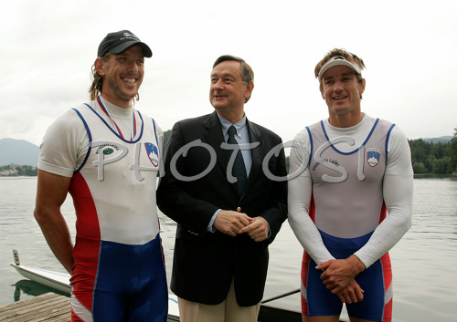 : Winners of double scull race, Iztok Cop (R) and Luka Spik of Slovenia (L) getting congratulations from Slovenian president, Mr. Danilo Turk (M) after their victory in double scull race of 53rd International Bled rowing regata. Bled rowing regata was held in Bled, Slovenia on 14th of June 2008.