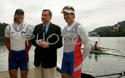 Bled ,Slovenia - 14.06.2008 : Winners of double scull race, Iztok Cop (R) and Luka Spik of Slovenia (L) getting congratulations from Slovenian president, Mr. Danilo Turk (M) after their victory in double scull race of 53rd International Bled rowing regata. Bled rowing regata was held in Bled, Slovenia on 14th of June 2008. Photo by: Primoz Jeroncic