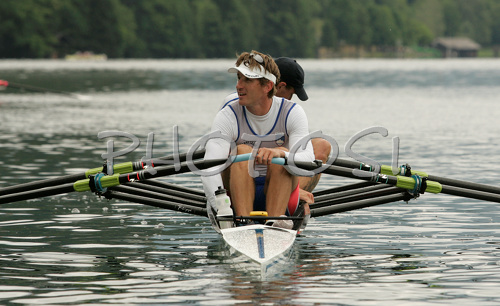 : Winners of double scull race, Iztok Cop (R) and Luka Spik of Slovenia (L) after their victory in double scull race of 53rd International Bled rowing regata. Bled rowing regata was held in Bled, Slovenia on 14th of June 2008.
