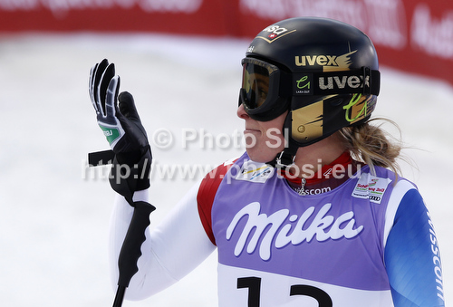 : Second placed Lara Gut of Switzerland reacts in the finish of the Ladies Super G race of Fis Alpine World Ski Championships 2013 Schladming, Austria. Ladies Super G race of Fis Alpine World Ski Championships 2013 Schladming, was held on Tuesday, 5th of February, 2013, on course Streicher in Schladming , Austria.