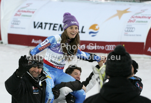 : Winner and new super-g World champions Tina Maze of Slovenia celebrates her victory in the finish of the Ladies Super G race of Fis Alpine World Ski Championships 2013 Schladming, Austria. Ladies Super G race of Fis Alpine World Ski Championships 2013 Schladming, was held on Tuesday, 5th of February, 2013, on course Streicher in Schladming , Austria.