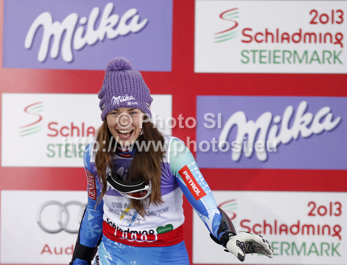 : Winner and new super-g World champions Tina Maze of Slovenia celebrates her victory in the finish of the Ladies Super G race of Fis Alpine World Ski Championships 2013 Schladming, Austria. Ladies Super G race of Fis Alpine World Ski Championships 2013 Schladming, was held on Tuesday, 5th of February, 2013, on course Streicher in Schladming , Austria.
