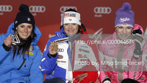 : Winner Marion Rolland of France (middle), second placed Nadia Fanchini of Italy (left) and third placed Maria Hoefl - Riesch of Germany (right) celebrate their medals won in the Ladies Downhill race of Fis Alpine World Ski Championships 2013 Schladming, Austria. Ladies Downhill race of Fis Alpine World Ski Championships 2013 Schladming, was held on Sunday, 10th of February, 2013, on course Streicher in Schladming, Austria.
