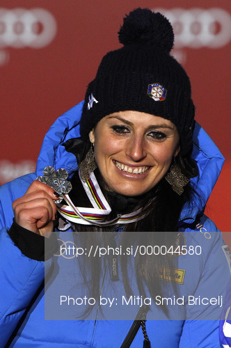 Schladming ,Austria - 10.02.2013 : Second placed Nadia Fanchini of Italy celebrates her medal won in the Ladies Downhill race of Fis Alpine World Ski Championships 2013 Schladming, Austria. Ladies Downhill race of Fis Alpine World Ski Championships 2013 Schladming, was held on Sunday, 10th of February, 2013, on course Streicher in Schladming, Austria. Photo by: Mitja Smid Bricelj/PhotoSI