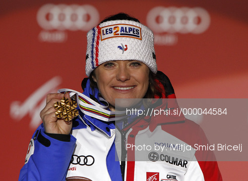 : Winner Marion Rolland of France celebrates her medal won in the Ladies Downhill race of Fis Alpine World Ski Championships 2013 Schladming, Austria. Ladies Downhill race of Fis Alpine World Ski Championships 2013 Schladming, was held on Sunday, 10th of February, 2013, on course Streicher in Schladming, Austria.