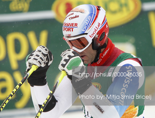 : Didier Defago of Switzerland reacts in the finish of the second run of the Mens Giant slalom race of Audi FIS Ski World cup Kranjska gora, Slovenija. The Mens Giant Slalom race of Audi FIS Ski World cup 2013 was held on Saturday, 9th of March, 2013, on course Podkoren in Kranjska gora, Slovenija.