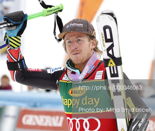 : Winner Ted Ligety of USA celebrates his medal won in Mens Giant slalom race of Audi FIS Ski World cup Kranjska gora, Slovenija. The Mens Giant Slalom race of Audi FIS Ski World cup 2013 was held on Saturday, 9th of March, 2013, on course Podkoren in Kranjska gora, Slovenija.