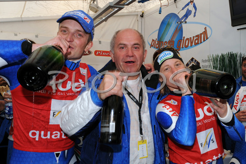 : Manfred Moelgg of Italy (L), FISI president Giovanni Morzenti (M) and Denise Karbon (R) celebrate after the alpine ski World Cup finals in Bormio, Italy, Saturday, March 15, 2008.