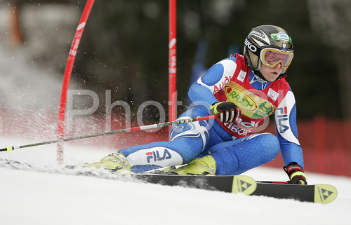 : 6th after first run Denise Karbon of Italy skiing in first run of women giant slalom World Cup race in Maribor, Slovenia. First giant slalom run of 44th Golden Fox trophy and Women FIS Alpine skiing World Cup was held in Maribor, Slovenia, on 12th of January 2008.