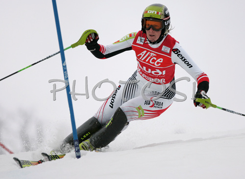 : Leader after first run, Nicole Hosp of Austria skiing in first run of women slalom World Cup race in Maribor, Slovenia. First slalom run of 44th Golden Fox trophy and Women FIS Alpine skiing World Cup was held in Maribor, Slovenia, on 13th of January 2008.