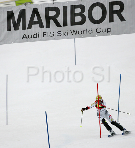 : Third placed Marlies Schild of Austria skiing in second run of women slalom World Cup race in Maribor, Slovenia. Slalom race of 44th Golden Fox trophy and Women FIS Alpine skiing World Cup was held in Maribor, Slovenia, on 13th of January 2008.