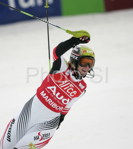 : Winner Nicole Hosp of Austria skiing in second run of women slalom World Cup race in Maribor, Slovenia. Slalom race of 44th Golden Fox trophy and Women FIS Alpine skiing World Cup was held in Maribor, Slovenia, on 13th of January 2008.