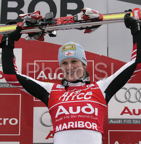 Maribor ,Slovenia - 13.01.2008 : Winner Nicole Hosp of Austria celebrating her victory women slalom World Cup race in Maribor, Slovenia. Slalom race of 44th Golden Fox trophy and Women FIS Alpine skiing World Cup was held in Maribor, Slovenia, on 13th of January 2008. Photo by: Primoz Jeroncic