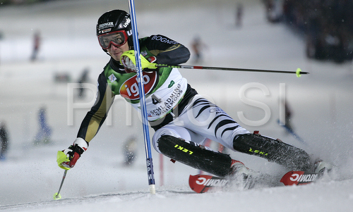 : Fourth placed after first run Felix Neureuther of Germany skiing in first run of men slalom World Cup race in Schladming, Austria. Slalom race of traditional Schladming Night race and Men FIS Alpine skiing World Cup was held in Schladming, Austria, on 22nd of January 2008.