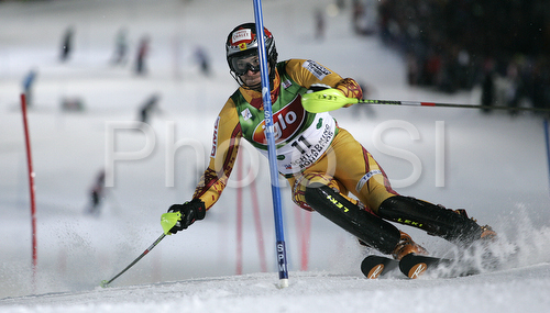 : Eighth placed after first run Michael Janyk of Canada skiing in first run of men slalom World Cup race in Schladming, Austria. Slalom race of traditional Schladming Night race and Men FIS Alpine skiing World Cup was held in Schladming, Austria, on 22nd of January 2008.