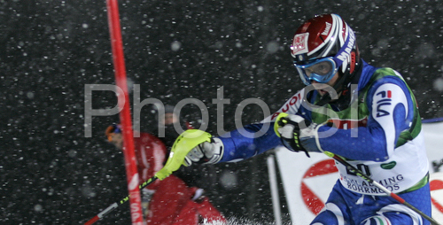 : Cristian Deville of Italy skiing in first run of men slalom World Cup race in Schladming, Austria. Slalom race of traditional Schladming Night race and Men FIS Alpine skiing World Cup was held in Schladming, Austria, on 22nd of January 2008.