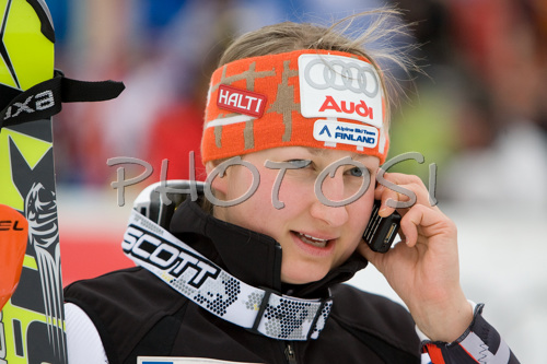 Ofterschwang ,Germany - 27.01.2008 : Tanja Poutiainen of Finland phones in the finish area after second run of FIS women alpine skiing World Cup slalom race in Ofterschwang, Germany. Slalom World cup race in Ofterschwang, Germany, was held on 27th of January 2008. Photo by: Mirko Guarriello / DIPAG / PhotoSI