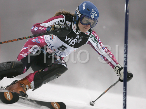 : Veronika Zuzulova of Slovakia skiing in first run of women slalom World Cup race in Zagreb, Croatia. Slalom race of Snow Queen Trophy 2008 and Women FIS Alpine skiing World Cup was held in Zagreb, Croatia, on 15th of February 2008.