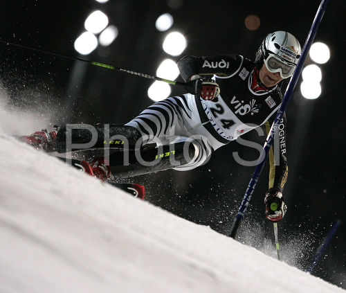 : Fanny Chmelar of Germany skiing in second run of women slalom World Cup race in Zagreb, Croatia. Slalom race of Snow Queen Trophy 2008 and Women FIS Alpine skiing World Cup was held in Zagreb, Croatia, on 15th of February 2008.