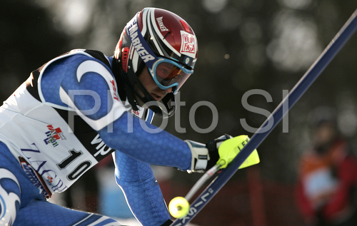 : Cristian Deville of Italy skiing in first run of men slalom World Cup race in Zagreb, Croatia. Slalom race of Men FIS Alpine skiing World Cup was held in Zagreb, Croatia, on 17th of February 2008.