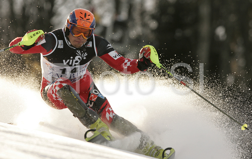 : Second placed after first run, Ivica Kostelic of Croatia skiing in first run of men slalom World Cup race in Zagreb, Croatia. Slalom race of Men FIS Alpine skiing World Cup was held in Zagreb, Croatia, on 17th of February 2008.
