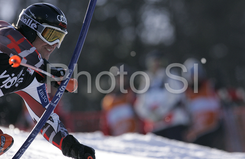 : Jukka Leino of Finland skiing in first run of men slalom World Cup race in Zagreb, Croatia. Slalom race of Men FIS Alpine skiing World Cup was held in Zagreb, Croatia, on 17th of February 2008.