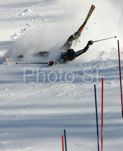 : Ted Ligety of USA falling in second run of men slalom World Cup race in Zagreb, Croatia. Slalom race of Men FIS Alpine skiing World Cup was held in Zagreb, Croatia, on 17th of February 2008.