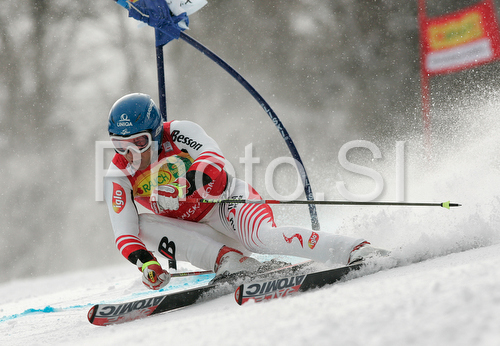 : Fourth placed after first run, Benjamin Raich of Austria skiing in first run of men giant slalom World Cup race in Kranjska Gora, Slovenia. Giant slalom race of Men FIS Alpine skiing World Cup was held in Kranjska Gora, Slovenia, on 8th of March 2008.