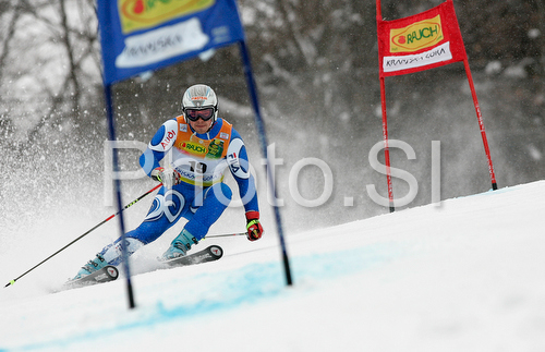: Peter Fill of Italy skiing in first run of men giant slalom World Cup race in Kranjska Gora, Slovenia. Giant slalom race of Men FIS Alpine skiing World Cup was held in Kranjska Gora, Slovenia, on 8th of March 2008.