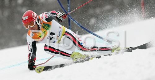 : Cyprien Richard of France skiing in first run of men giant slalom World Cup race in Kranjska Gora, Slovenia. Giant slalom race of Men FIS Alpine skiing World Cup was held in Kranjska Gora, Slovenia, on 8th of March 2008.