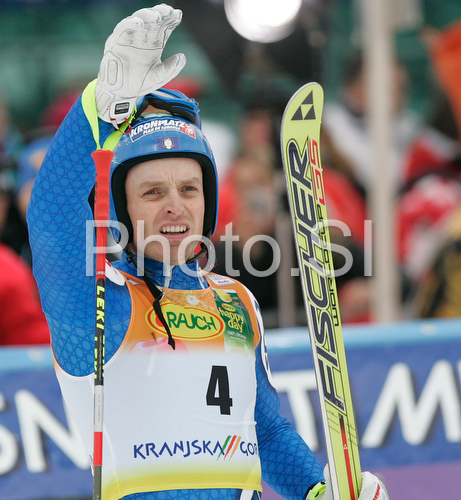 : Second placed Manfred Moelgg of Italy reacts in finish of men giant slalom World Cup race in Kranjska Gora, Slovenia. Giant slalom race of Men FIS Alpine skiing World Cup was held in Kranjska Gora, Slovenia, on 8th of March 2008.