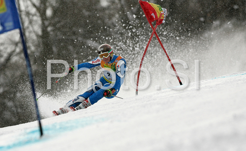 : Leader after first run, Massimiliano Blardone of Italy skiing in first run of men giant slalom World Cup race in Kranjska Gora, Slovenia. Giant slalom race of Men FIS Alpine skiing World Cup was held in Kranjska Gora, Slovenia, on 8th of March 2008.