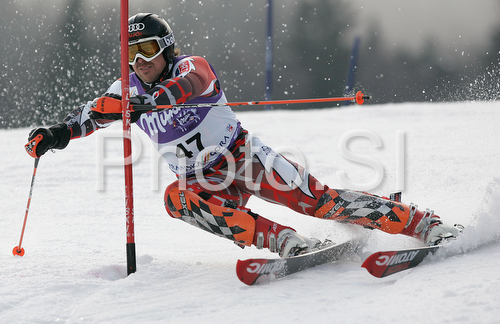 : Jukka Leino of Finland skiing in first run of men slalom World Cup race in Kranjska Gora, Slovenia. Slalom race of Men FIS Alpine skiing World Cup was held in Kranjska Gora, Slovenia, on 9th of March 2008.