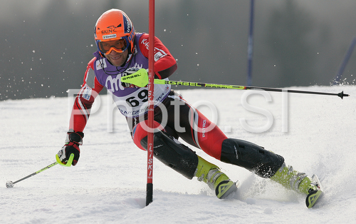 : Matija Zavirsek of Slovenia skiing in first run of men slalom World Cup race in Kranjska Gora, Slovenia. Slalom race of Men FIS Alpine skiing World Cup was held in Kranjska Gora, Slovenia, on 9th of March 2008.