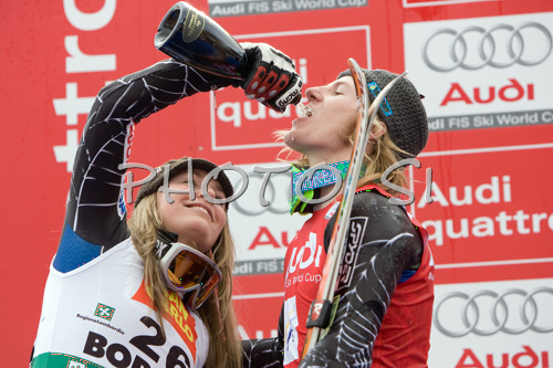 : Lindsey Vonn of the United States (L) pours sparkling wine to her teammate Ted Ligety (R) at the alpine ski World Cup finals in Bormio, Italy, Friday, March 14, 2008.