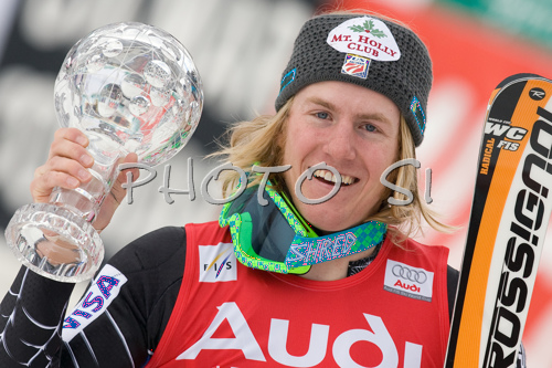 : Ted Ligety of the United States holds the crystal ball trophy of the mens giant slalom discipline title at the alpine ski World Cup finals in Bormio, Italy, Friday, March 14, 2008.