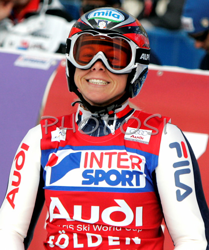 : Denise Karbon of Italy reacts in finish of first run of Women giant slalom Audi FIS Ski World Cup 2008-09 opening race. First race of Women Audi FIS Ski World Cup season 2008-09 was held on Saturday, 25th of October 2008 in Soelden, Austria.