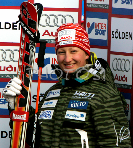 : Leading after first run Tanja Poutiainen of Finland reacts in finish of first run of Women giant slalom Audi FIS Ski World Cup 2008-09 opening race. First race of Women Audi FIS Ski World Cup season 2008-09 was held on Saturday, 25th of October 2008 in Soelden, Austria.